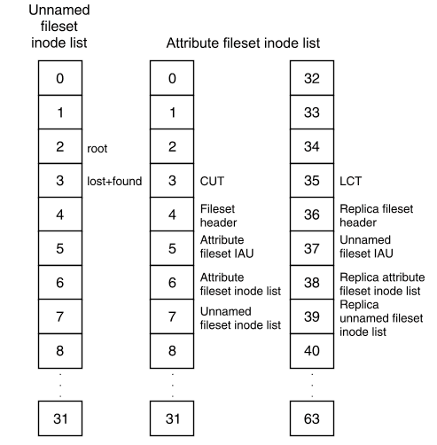 The attribute fileset's inode list contains a few entries that are replicas of one another. For example, inodes 4 and 36 both reference copies of the fileset header file. The replicated inodes are used by fsck to reconstruct the filesystem in the event of damage to either one of the replicas. Although the two initial inode list extents belonging to the attribute fileset are logically contiguous, they are physically separated. This helps to ensure the integrity of the replicated information and reduces the chance that localized disk damage might result in complete loss of the filesystem.